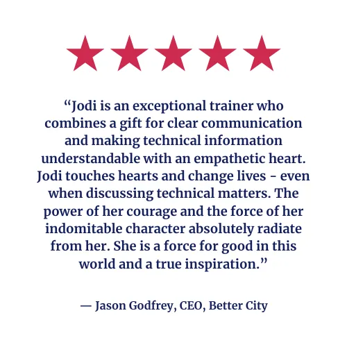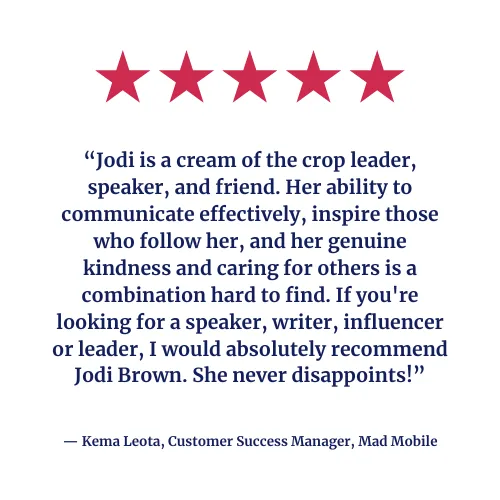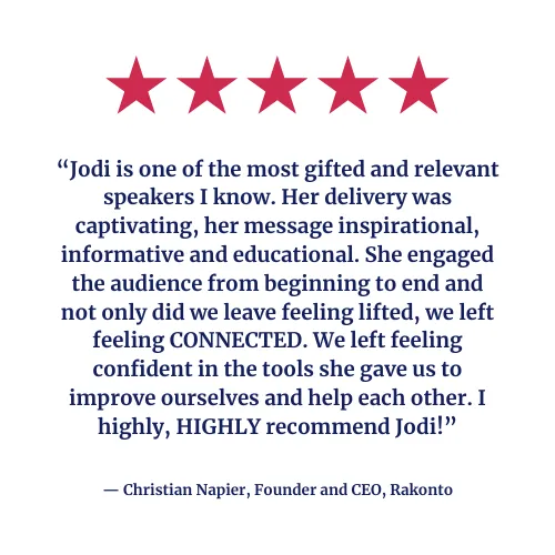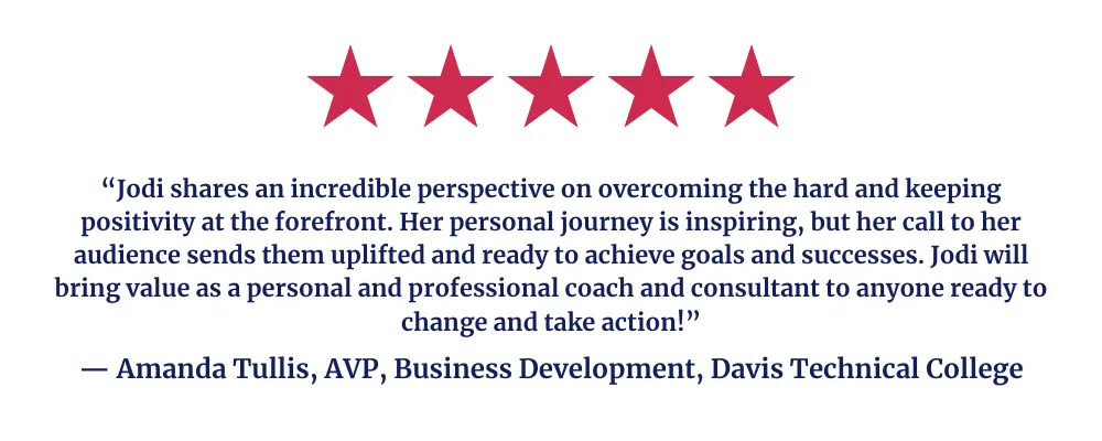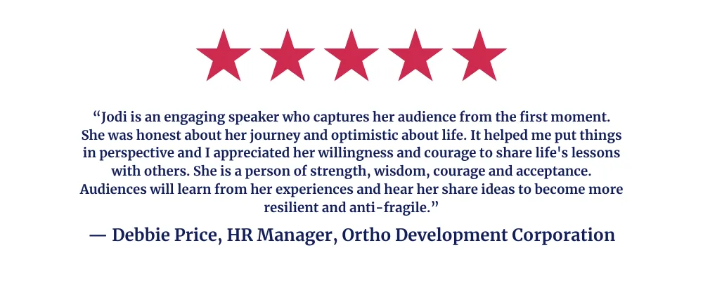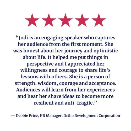 Jodi is an award-winning speaker and bestselling author who knows firsthand the power of resilience. After a life-altering health crisis, she transformed her personal trials into a mission: helping others thrive through adversity. Today, she works with leaders, teams, and communities to build cultures of courage, connection, and growth.